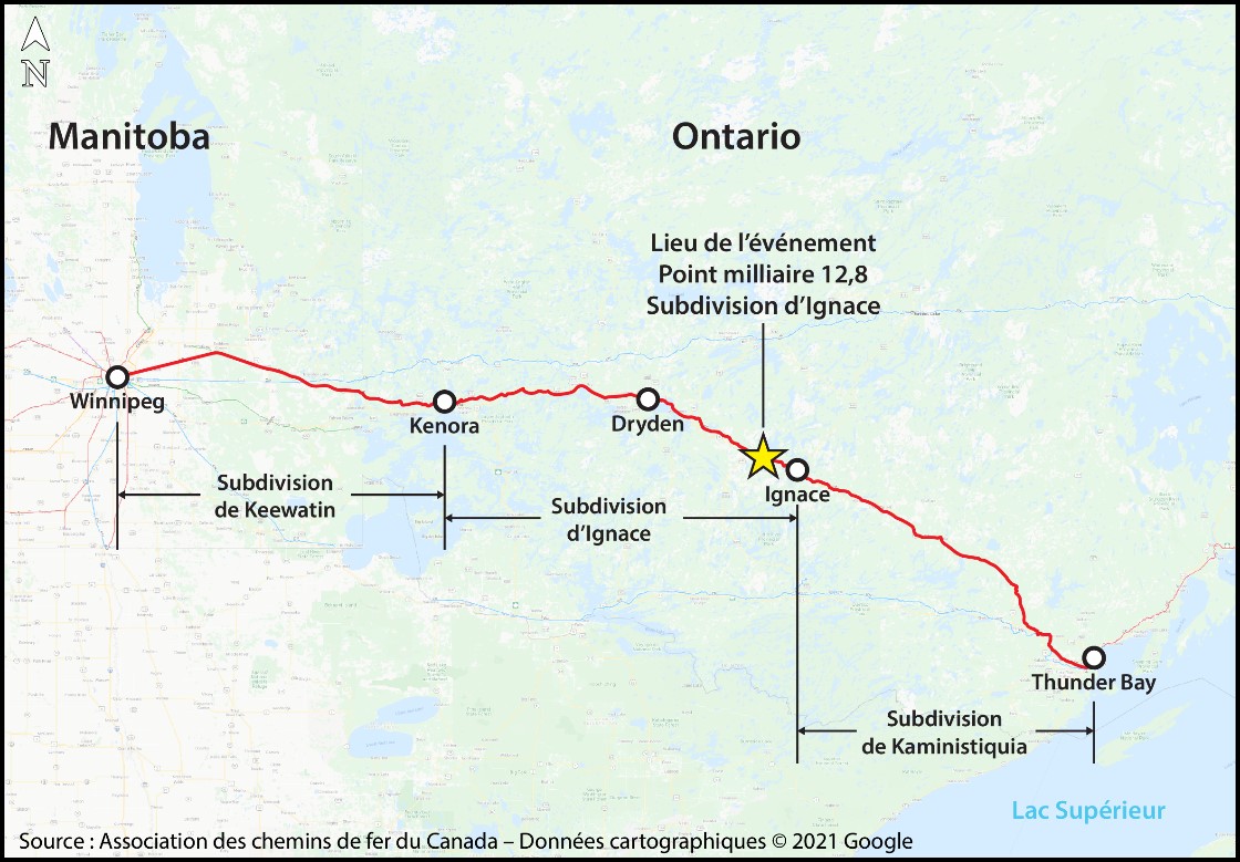 Vers 14 h 43Note de bas de page 5, alors que le train roulait à 46 mi/h en direction est dans la subdivision d’Ignace, un freinage d’urgence provenant de la conduite générale a été déclenché près d’Ignace (Ontario). Une fois le train immobilisé, l’équipe a effectué une inspection et a constaté que 53 wagons avaient déraillé au point milliaire 12,8 (figure 1). Plusieurs wagons déraillés avaient subi une brèche, ce qui a entraîné le déversement de leur chargement de céréales (blé et lin). Personne n’a été blessé.
