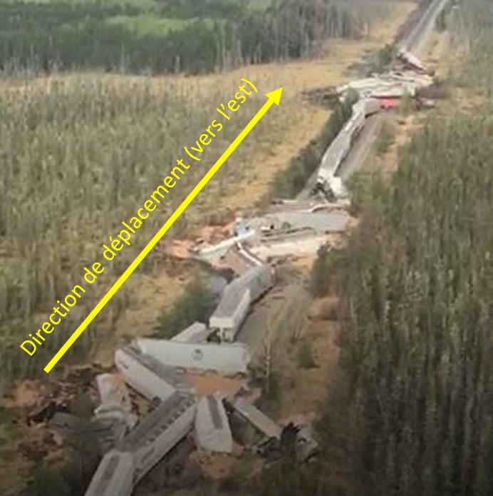 - Alors que le train circulait dans la subdivision d’Ignace de la Compagnie de chemin de fer Canadien Pacifique, sur un tronçon de voie en alignement présentant des mesures différentielles de nivellement transversal, il est probable que la capacité portante de la plateforme en tourbe molle et saturée a été dépassée, entraînant un affaissement soudain de la plateforme qui a provoqué le déraillement.