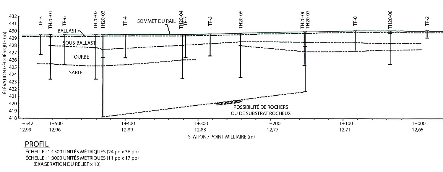 La figure 5 montre les endroits où 8 forages d’essai ont été effectués et où des puits d’exploration ont été creusés entre les points milliaires 12,67 et 12,99, ainsi que le profil de sol à ces endroits.