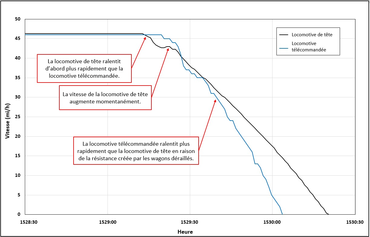 Une unité de détection et de freinage (UDF) a un étrangleur de la conduite générale de plus petite taille que celle des valves de commande de frein automatique et de mise à l’atmosphère de locomotive, et il faut plus de temps pour propager un signal de freinage d’urgence. La simulation a montré que si le train à l’étude avait été équipé d’une locomotive télécommandée en queue de train plutôt que d’une UDF, la propagation du signal de freinage d’urgence aux wagons de queue aurait été plus rapide et les forces exercées le long du train générées par la queue du train sur les wagons précédents pendant le freinage d’urgence auraient été moindres.