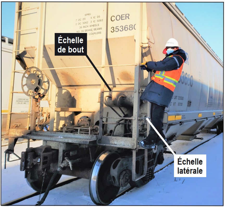 Contrairement à la réglementation en vigueur, le train ne s’est pas arrêté avant d’entrer dans le tunnel pour permettre au chef de train adjoint de descendre du wagon et de franchir le tunnel à pied. Pour pouvoir demeurer sur le wagon lors du franchissement du tunnel et éviter de se retrouver entre l’échelle latérale du wagon et la paroi de béton, le chef de train adjoint s’est repositionné sur l’échelle de bout du wagon de tête. Ce repositionnement sur l’échelle de bout était contraire à l’instruction du CN qui stipule que tous les déplacements du personnel sur du matériel roulant doivent se faire sur l’échelle latérale (figure 4)Note de bas de page 9. Les employés peuvent ainsi descendre plus facilement du wagon en cas d’urgence. De plus, cette position réduit les risques de blessures graves en cas de chute accidentelle. Cette équipe avait l’habitude de procéder de cette manière, à l’insu des superviseurs responsables du triage, afin de diminuer le nombre d’arrêts nécessaires pour monter sur du matériel roulant ou en ou descendreNote de bas de page 10, et de réduire la durée totale d’occupation du passage à niveau public de la rue Bridge.