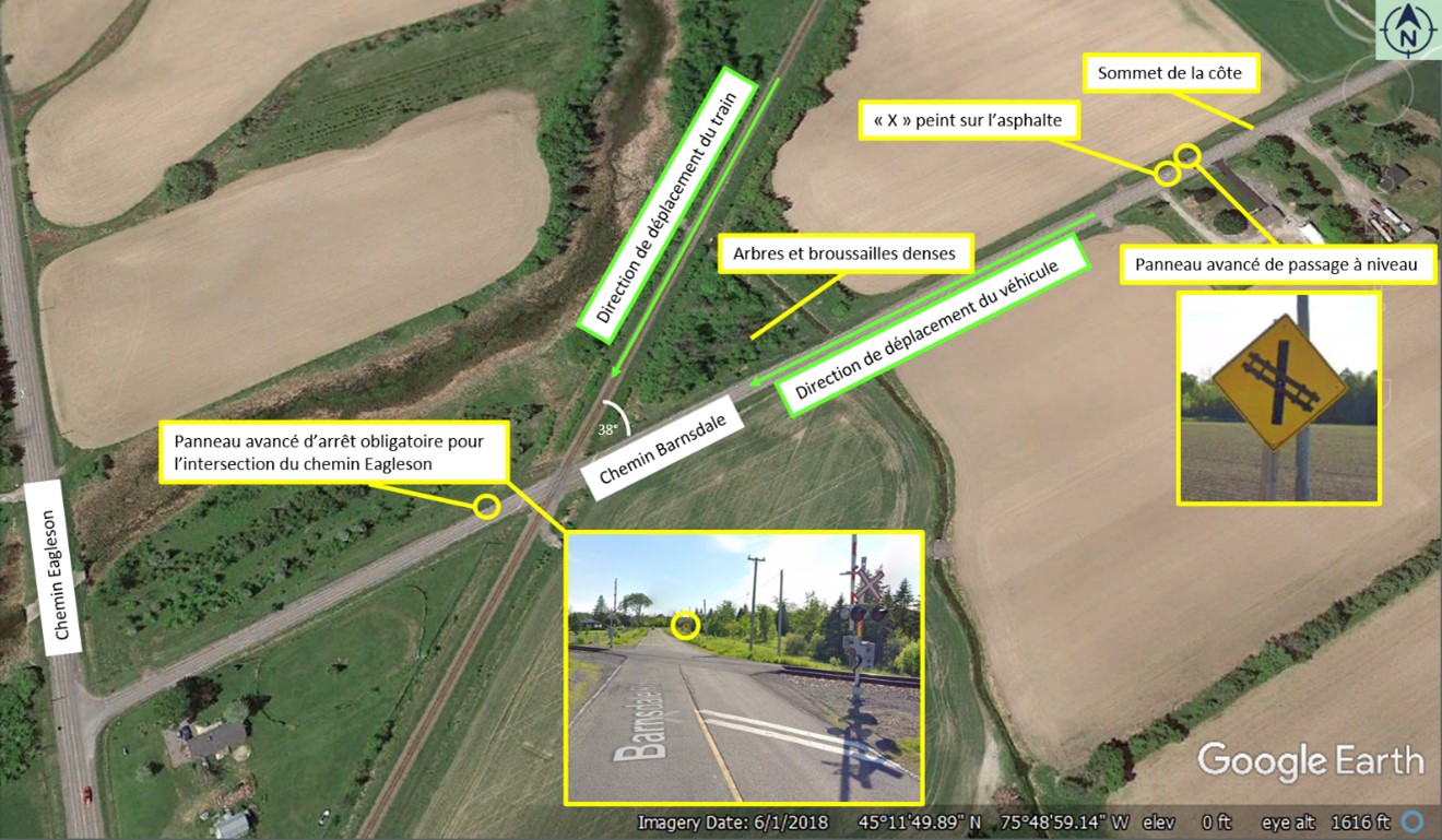 À environ 12 h 10, un employé de Westboro Utilities a quitté le travail pour rentrer chez lui au volant d’une fourgonnette tronquée GMC 3500 de 2017 appartenant à l’entreprise (le véhicule). L’entreprise avait autorisé ses employés à partir plus tôt cette journée-là étant donné la fête du Canada le lendemain. Le conducteur a pris sa route habituelle pour se rendre chez lui, c’est-à-dire en direction sud-ouest sur le chemin Barnsdale, une route asphaltée à 2 voies située dans une zone rurale. Cette route traverse le passage à niveau public du chemin Barnsdale, qui est muni de feux clignotants, d’une cloche et de barrières.