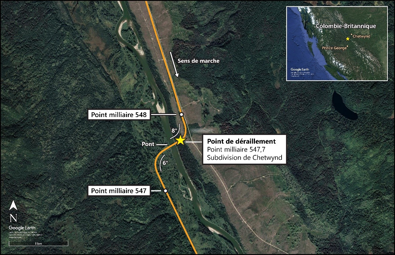 Le déraillement s’est produit au point milliaire 547,7, dans une région éloignée à environ 85 milles au nord de Prince George. Près du point de déraillement, dans le sens de déplacement, la voie présente une courbe vers la droite de 8°. Elle traverse ensuite un pont au-dessus de la rivière Parsnip, puis fait une courbe vers la gauche de 6° (figure 1).