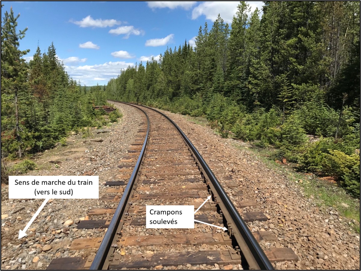 En direction sud, la courbe de 8° commence aux environs du point milliaire 548 et s’étend sur une distance de 1278 pieds. Le dévers de la courbe est de 3,51 poucesNote de bas de page 3 . Le dévers équilibré (c’est-à-dire le dévers qui permet de compenser entièrement l’effet de la force centrifuge) dans une courbe de 8° à une vitesse de 30 mi/h est de 5 pouces. Les Normes de la voie de l’Ingénierie du CN prévoient un dévers maximal de 5 pouces et permettent aux courbes d’avoir un dévers de jusqu’à 2 pouces inférieur au dévers équilibré; le RSV permet un dévers de jusqu’à 3 pouces inférieur au dévers équilibré. Toutefois, lorsque le dévers est insuffisant dans les courbes où l’on compte un grand nombre de traverses défectueuses, les forces exercées par les trains peuvent provoquer le soulèvement des crampons du côté intérieur de la voie lorsque le rail haut roule ou sort des selles.