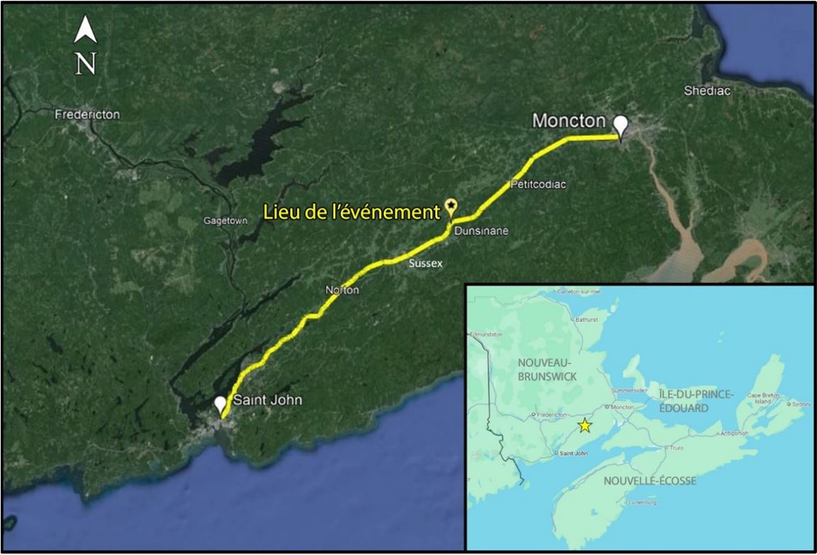 Le 30 octobre 2023, le train de marchandises L59411-30 de la Compagnie des chemins de fer nationaux du Canada (CN) a quitté la gare de triage Gordon du CN à MonctonTous les lieux sont situés dans la province du Nouveau-Brunswick, sauf indication contraire. à destination de Saint John. Le train de marchandises mixtes était formé de 2 locomotives de tête (CN 3306 et CN 2932) et de 46 wagons, dont 10 wagons-citernes transportant des marchandises dangereuses. Il pesait environ 5115 tonnes et avait une longueur de quelque 2832 pieds. L’équipe de train se composait de 1 mécanicien de locomotive, 1 chef de train et 1 mécanicien de locomotive stagiaire. Tous les membres de l’équipe étaient qualifiés pour leur poste respectif, satisfaisaient aux exigences en matière de repos et d’aptitude au travail, et connaissaient bien le territoire.