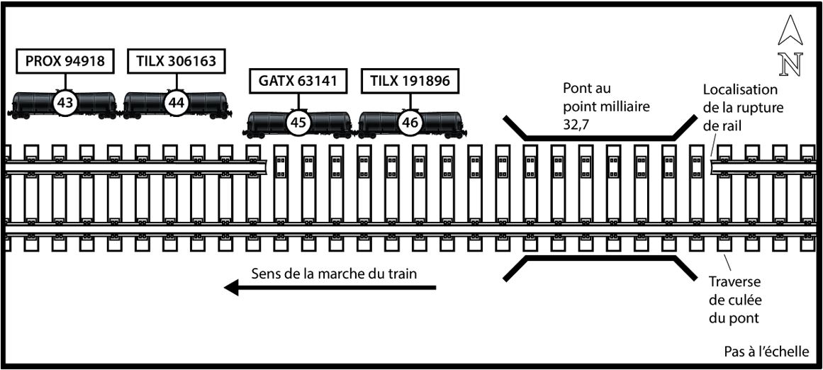 Les 4 wagonsLes wagons PROX 94918, TILX 306163, GATX 63141 et TILX 191869, respectivement. qui ont déraillé, aux positions 43 à 46, étaient des wagons-citernes transportant des marchandises dangereusesLes wagons aux positions 43, 44 et 45 étaient des wagons-citernes DOT-112J transportant du butane (UN1075), et le wagon à la position 46 était un wagon-citerne DOT-111 transportant du méthanol (UN1230).. Ils avaient déraillé du côté nord de la voie, à l’ouest d’un petit pont (figure 2). Les wagons aux positions 43 et 44, demeurés attelés, s’étaient renversés sur le côté, tandis que les wagons aux positions 45 et 46, demeurés attelés, s’étaient retournés. L’examen visuel des wagons-citernes a démontré qu’il n’y avait aucune brèche dans la coque des citernes.