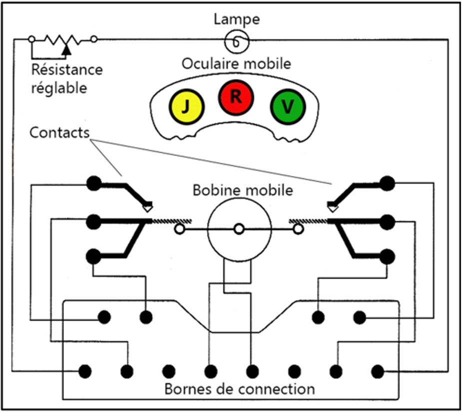 Chaque feu est muni de 3 oculaires de couleur (un jaune, un rouge et un vert) pouvant, sous l’action d’une commande électrique, être amenés tour à tour devant le faisceau lumineux de la lampe par un mécanisme à 3 positions. Des contacts électriques permettent au système de valider la position des oculaires mobiles (figure 5).