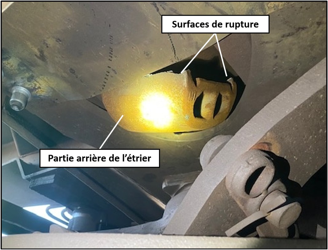 L’examen visuel de l’étrier d’attelage en cause a permis d’identifier que les 2 bretelles s’étaient rompues par rupture fragile, près de leur partie arrièreLe plan de rupture se trouvait à environ 19 mm d’un des 4 endroits où une coupe transversale est requise par les spécifications de l’AAR afin de permettre d’évaluer la solidité interne de la pièce..