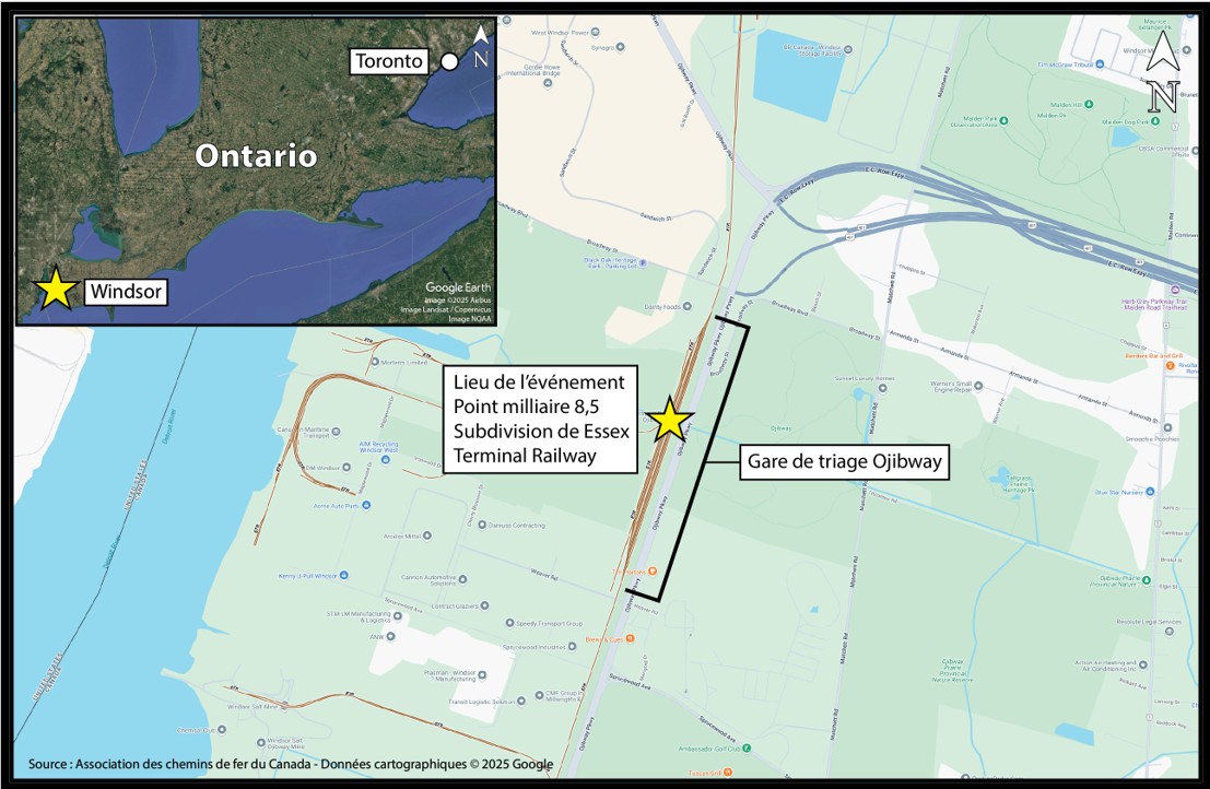 Le 16 février 2025, vers 10 hLes heures sont exprimées en heure normale de l’Est., l’équipe de l’affectation de triage 0700 de la Essex Terminal Railway Company (ETR)L’Essex Terminal Railway Company est un chemin de fer d’intérêt local de compétence fédérale qui exploite environ 54 km de voies en Ontario, partant du côté est de Windsor et se terminant à Amherstburg. effectuait des manœuvres à la gare de triage Ojibway (point milliaire 8,5 de la subdivision Essex Terminal Railway) à Windsor (Ontario) (figure 1), lorsque 2 wagons, qui avaient été dételés en mouvementLe dételage en mouvement est une manœuvre qui consiste à dételer un ou plusieurs wagons en mouvement et à leur permettre de rouler sous sur leur propre élan jusqu’à une voie spécialement désignée. et roulaient à environ 5 mi/h, ont heurté un employé à l’entretien de la voie (employé à l’entretien) qui se trouvait entre les rails de la voie d’accès. Au moment de l’événement, l’employé à l’entretien déneigeait des lames d’aiguille à l’aide d’une souffleuse à feuilles à essence attachée à son dos. L’employé à l’entretien a subi des blessures graves.