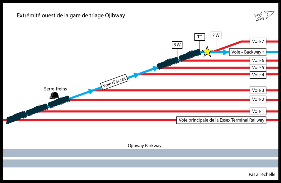 Vers 9 h 40, l’équipe de l’affectation de triage se trouvait à l’extrémité ouest de la gare de triage, se préparant pour la prochaine manœuvre, qui consistait à dételer en mouvement 2 wagons-citernes de sorte qu’ils roulent vers l’est sur la voie d’accès en direction de la voie « Backway », située entre les voies 6 et 7 (figure 2).