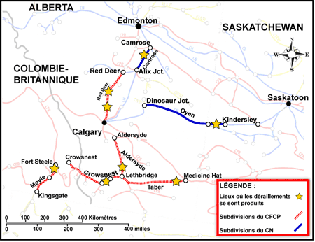 Ces événements similaires ont incité le BST à rechercher les facteurs systémiques sous-jacents. À cette fin, il a institué une enquête sur des problèmes de sécurité relative aux déraillements survenus sur des voies principales de deuxième catégorie du Canadien National (CN) et du CFCP qui étaient situées dans l'ouest du Canada. Sachant que les facteurs en cause auraient vraisemblablement une incidence dans des subdivisions autres que celles qui sont énumérées dans le Tableau 1, le BST a élargi le champ d'application de l'enquête sur des problèmes de sécurité pour y inclure d'autres subdivisions similaires. La sélection des subdivisions a tenu compte des caractéristiques de la voie (voies principales de deuxième catégorie), du trafic, de la situation géographique (ouest du Canada) et d'un historique de déraillements récents. Les 13 subdivisions sélectionnées consistaient en 5 subdivisions Note de bas de page 3 situées le long de voies principales de deuxième catégorie du CFCP (527 milles), entre North Portal (Saskatchewan) et Kingsgate (Colombie-Britannique), 2 subdivisions (116 milles) situées entre Calgary et Lethbridge (Alberta) Note de bas de page 4 et 6 subdivisions du CN (837 milles) situées en Alberta et en Saskatchewan Note de bas de page 5.