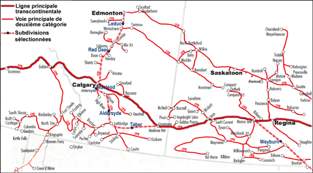 La sélection des subdivisions a tenu compte de deux critères : la subdivision devait acheminer plus de 10 MTB par année et la majorité de ses rails devait être de moins de 130 livres. Initialement, le BST a demandé des données portant sur 13 subdivisions de l'ouest (7 du réseau du CFCP et 6 de celui du CN) qui pourraient correspondre aux critères de sélection. L'examen des données fournies a révélé que seulement 4 subdivisions du CFCP et 3 subdivisions du CN répondaient aux critères de sélection. On a donc demandé des données portant sur 7 autres subdivisions du CFCP, dont 2 répondaient aux critères. La même demande de données additionnelles n'a pas été adressée au CN, car on croyait qu'aucune autre des subdivisions du CN ne répondrait aux critères de sélection. Le Tableau 2 dresse la liste des subdivisions au sujet desquelles on a fait une demande initiale de données au CFCP et au CN, et de celles qui ont fait l'objet de la demande de suivi au CFCP. Les subdivisions dont le nom est rayé sont celles qui ne répondaient pas aux critères de sélection. La Figure 2 illustre la situation géographique des subdivisions du CFCP qui ont été sélectionnées.