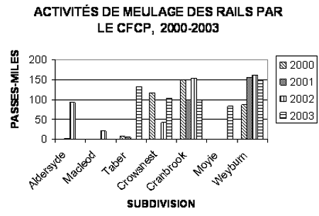 Les cycles de meulage préventif font appel à des travaux de meulage qui sont effectués à des intervalles établis en fonction du tonnage ou du temps et qui visent à atténuer ou supprimer les petites fissures de fatigue qui sont causées par le passage de millions de roues sur le rail. L'intervalle de meulage dépend aussi de la dureté et de la courbure des rails. L'AREMA recommande que les rails des courbes de trois degrés ou plus qui sont faites de rails standard soient meulés après le passage de 8 à 12 MTB, que ceux des courbes de moins de trois degrés soient meulés après le passage de 16 à 24 MTB et que les rails des tronçons en alignement droit soient meulés après le passage de 40 à 60 MTB. Autrement dit, l'AREMA recommande que les intervalles de meulage soient déterminés par la courbure de la voie et par les niveaux de trafic. Les intervalles en question supposent un meulage en un passage à une vitesse de meulage de 6 à 14 mi/h. Le meulage des rails étant une opération d'entretien fort coûteuse, le CFCP et le CN concentrent leurs travaux de meulage dans les subdivisions qui acheminent le tonnage le plus élevé.