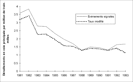 dangereuses. Au cours des années qui ont suivi, la plupart de ces décisions ont été mises en application, parallèlement à la mise en place d'un programme permanent d'enquête sur les événements et de recherches sur les facteurs des déraillements. Toutes ces activités ont manifestement eu un effet sur les taux de déraillements au cours des années quatre-vingts.