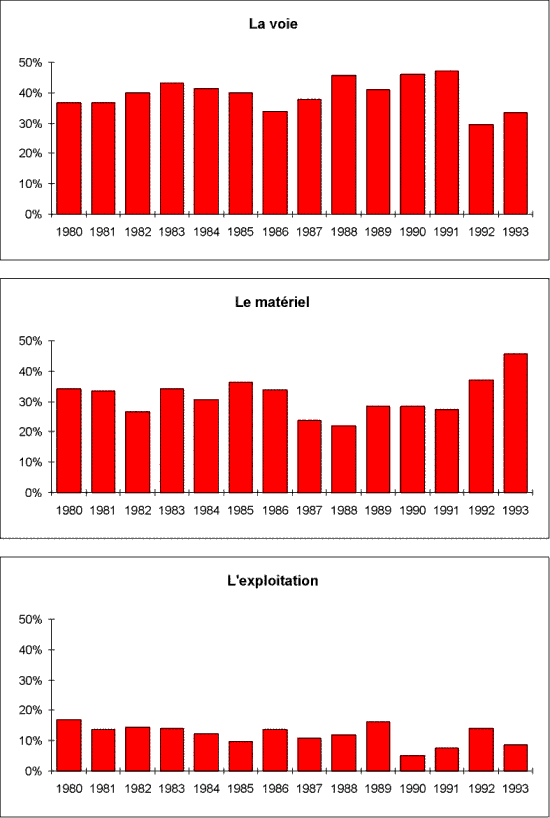 On trouvera à la figure 2 la répartition proportionnelle des déraillements selon ces grandes catégories, de 1980 jusqu'à maintenant3. On constate des changements d'une année à l'autre, mais il semble surprenant que, pendant une période où le nombre total de déraillements a diminué de plus de la moitié, le partage entre les catégories de causes soit resté si stable. Cela porte à croire que les progrès de la dernière décennie n'ont pas été réalisés par un grand bond en avant dans un seul domaine, mais sont plutôt le fruit de nombreuses réussites modestes.