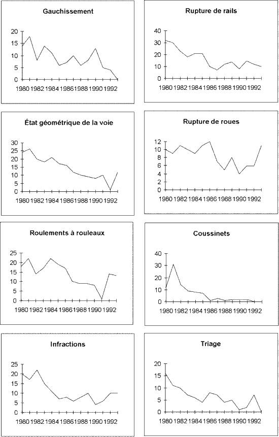 Au-delà de ces effets particuliers, cependant, il est intéressant d'observer les configurations généralement convergentes de ces causes diverses. La plupart des courbes, en effet, se caractérisent par une diminution, suivie d'une certaine stabilisation. Mais cette stabilisation s'observe à des moments différents. Si l'on compare les tendances des déraillements avant 1988 et celles après 1988, on remarque un changement très net, alors qu'il n'en va pas de soit pour les causes prises une à une. Autrement dit, la stabilisation de 1988 est probablement attribuable à l'action convergente de plusieurs facteurs distincts.