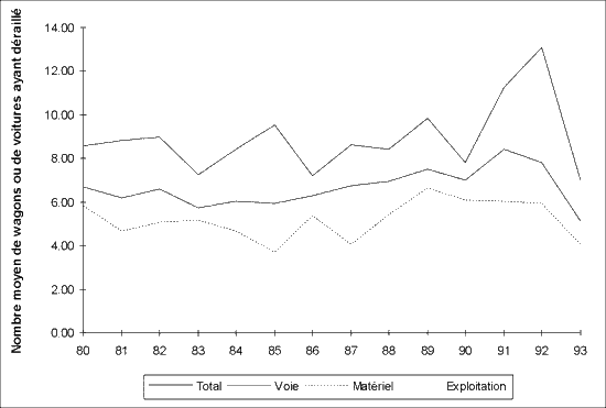 Le nombre de déraillements mettant en cause plus de cinq wagons ou voitures est passé de plus de 100 en 1980 à quelque 50 en 1985 et est resté à peu près le même depuis. Quant au nombre de déraillements mettant en cause de deux à cinq wagons ou voitures, il a diminué de 1981 à 1988 et est resté stable par la suite.
