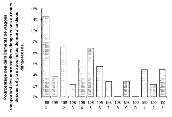 L'une des principales préoccupations liées à la sécurité en ce qui a trait aux déraillements en voie principale est la fuite de marchandises dangereuses qui peut s'ensuivre. Le pourcentage des déraillements mettant en cause des wagons transportant des marchandises dangereuses est passé de 15 p. 100 en 1980 à 35 p. 100 en 1993. Cette augmentation est en partie attribuable à l'élargissement de la définition de l'expression «marchandise dangereuse», qui comprend maintenant considérablement plus de marchandises. Elle est peut-être aussi attribuable à l'accroissement de la proportion des trains transportant des marchandises dangereuses.