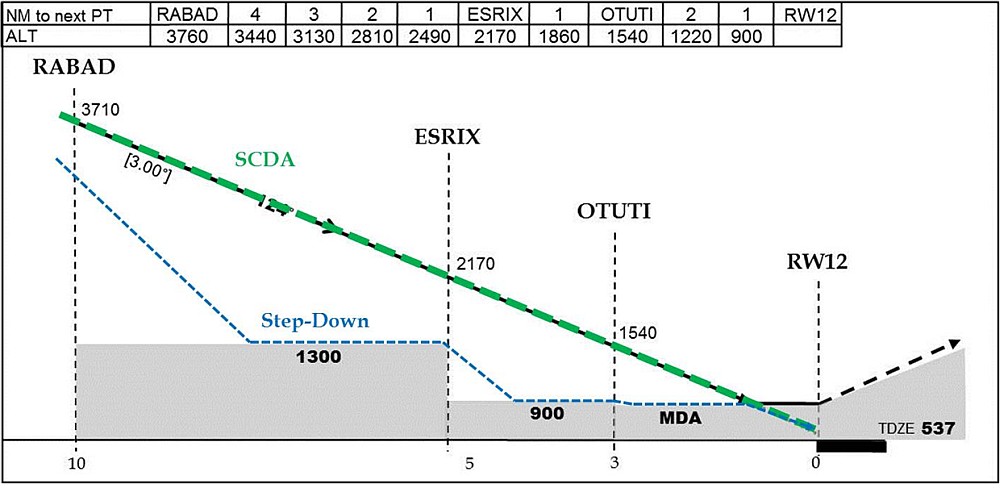 Il existe essentiellement 2 techniques pour effectuer la descente finale au cours d'une approche de non-précision (NPA), la descente par paliers et la descente finale stabilisée avec un angle constant (SCDA).