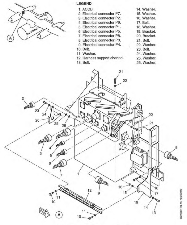 Après l’atterrissage du C-FWEP, l’équipe des opérations techniques de WestJet Encore a entrepris une inspection de l’avion. On a constaté des signes d’arc électrique venant d’un câble d’alimentation électrique triphasée de 115 V c.a. dans le logement de train droit, à la boîte du contacteur c.a. de l’ensemble de connecteurs électriques (code indicateur 2421-P5-2) (figure 1).