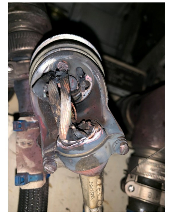 On a défait l’ensemble de connecteurs durant la dépose et on l’a expédié au Laboratoire d’ingénierie du Bureau de la sécurité des transports du Canada (BST) à Ottawa (Ontario) à des fins d’examen. L’ensemble de connecteurs et le câblage connexe étaient lourdement endommagés par la chaleur et des arcs électriques (figure 2). Les fûts à sertir de plusieurs broches avaient complètement fondu à un point tel que les extrémités d’appariement des broches étaient détachées de leurs câbles respectifs. La partie sertie de l’une des broches avait elle aussi fondu, et il manquait la section de câble entre ce point et le serre-câble, qui et n’a pas été retrouvée.