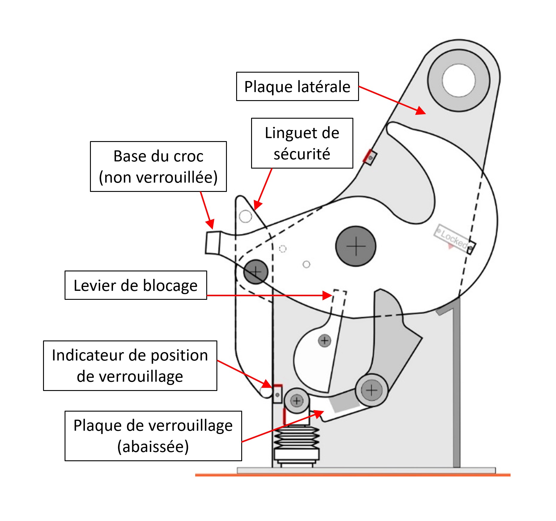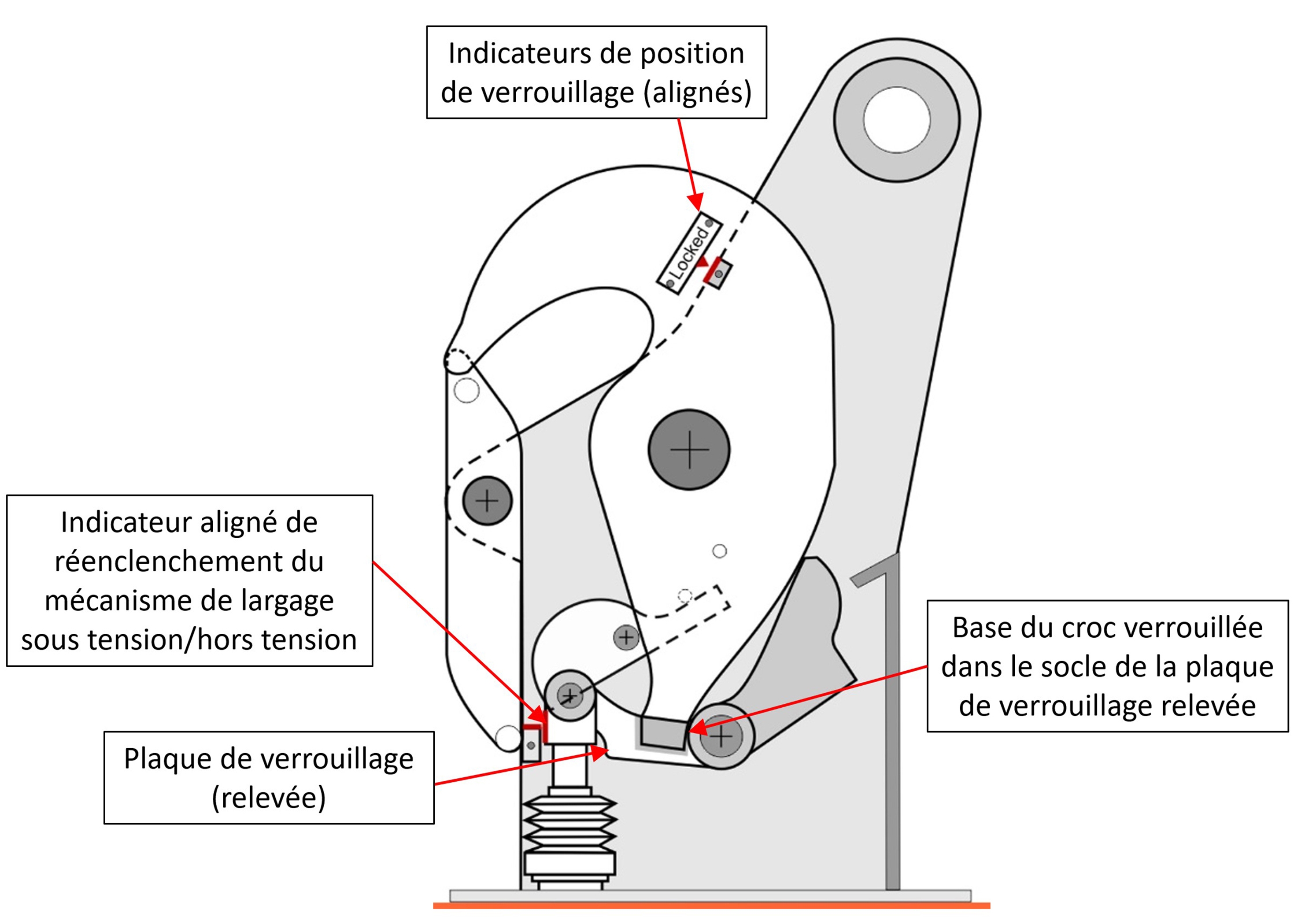 Si le levier de blocage est contourné et que la base de chaque croc de dégagement ne tourne pas pour bloquer sa plaque de verrouillage, celle-ci peut se relever. Le mécanisme de largage sous tension/hors tension à bord de l’embarcation de sauvetage peut se remettre en position de réenclenchement sans que la base de chacun des crocs de dégagement soit fixée dans la coche de sa plaque de verrouillage. Ainsi, l’opérateur à bord de l’embarcation de sauvetage peut avoir l’impression que les crocs sont réenclenchés et verrouillés alors qu’en réalité, ils ne le sont pas. Les essais ont de plus révélé qu’une friction entre le levier de blocage et la plaque latérale du croc peut à l’occasion empêcher le levier de blocage de retrouver sa position de verrouillage.