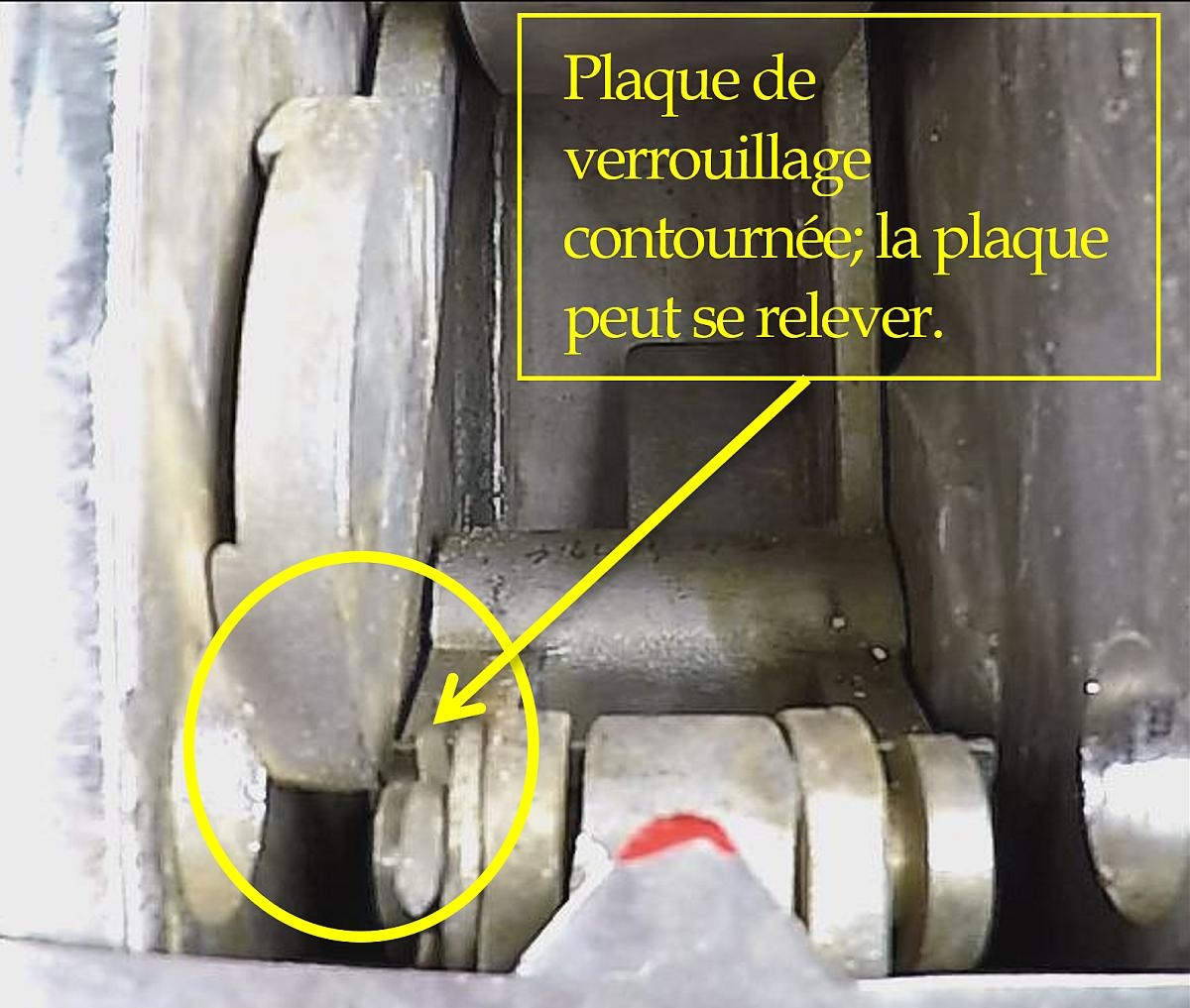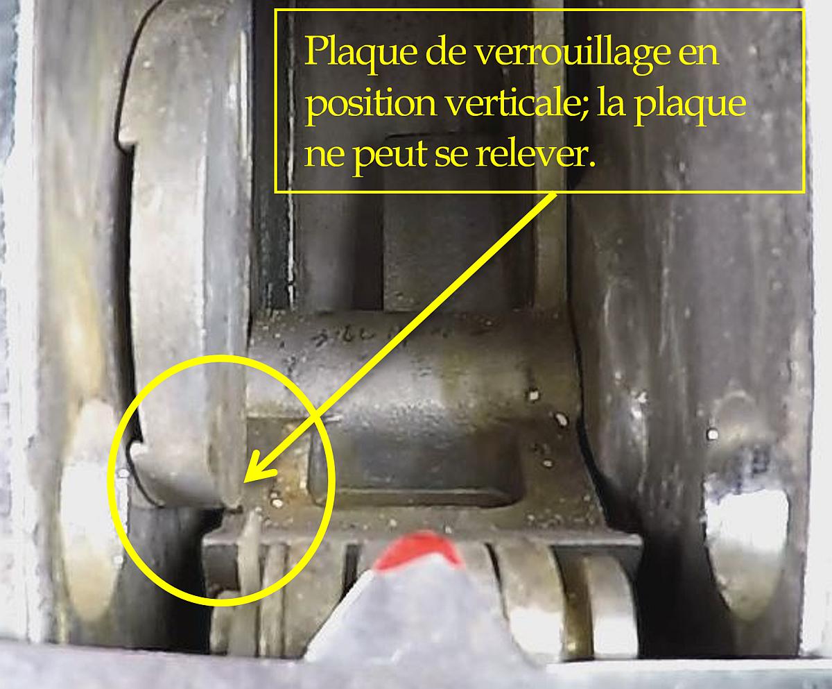 Des essais de fonctionnement répétés de la plaque de verrouillage et de son réenclenchement ont eu lieu pour cerner toute anomalie ou tout défaut possible. On a noté que durant la procédure de réenclenchement du croc avant ou du croc arrière, il est possible de contourner le levier de blocage de chacun des crocs (figures 3 et 4).