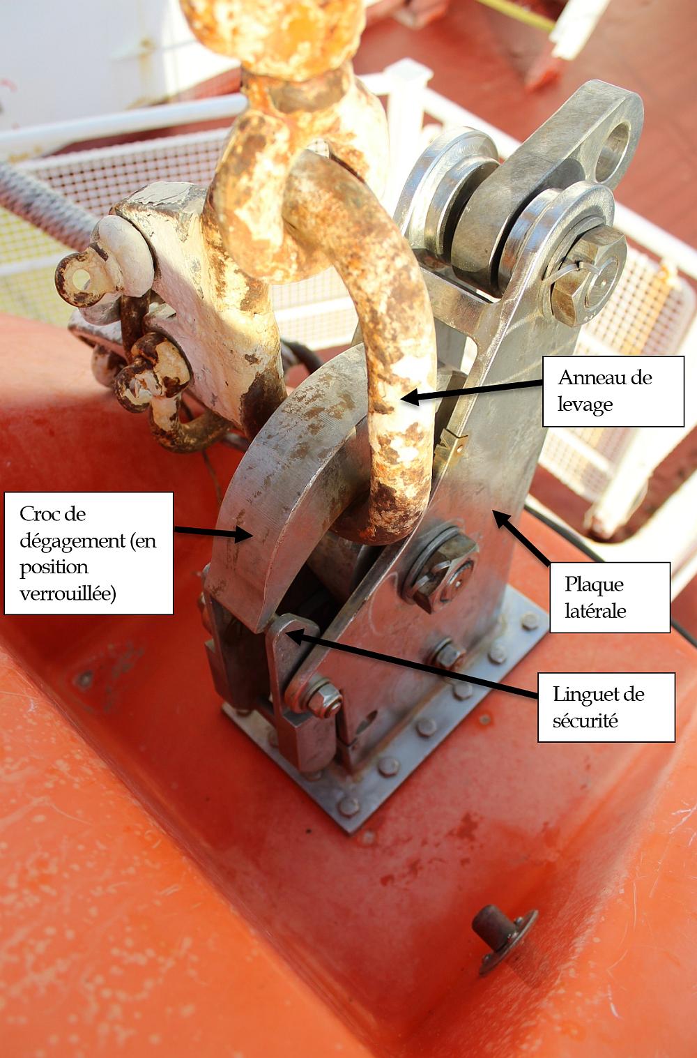 Les crocs de dégagement pouvaient supporter la charge grâce aux anneaux de levage de 28 mm utilisés dans l’événement à l’étude, avec le mécanisme de largage sous tension/hors tension de l’embarcation de sauvetage réenclenché, et les crocs non verrouillés. Or, cela pourrait aller à l’encontre de l’article 4.4.7.6.8 du Recueil international de règles relatives aux engins de sauvetage (Recueil LSA) (2011), qui stipule que des crocs de dégagement ne doivent pas supporter une charge quand ils ne sont pas verrouillés.