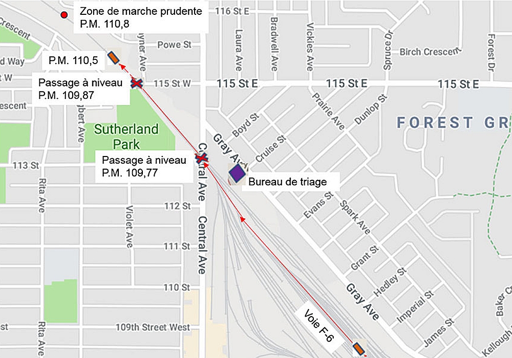 Le 27 mars 2016, vers 2 h 23, heure normale du Centre, un wagon-trémie couvert vide a roulé de façon non contrôlée vers l'ouest à partir de la gare de triage Sutherland du Chemin de fer Canadien Pacifique (CP), à l'est de Saskatoon (Saskatchewan), puis sur la voie principale de la subdivision de Sutherland du CP. Le wagon à la dérive a parcouru environ 1 mille et traversé 2 passages à niveau publics munis de dispositifs de signalisation automatique (feux clignotants et cloche). Le wagon à la dérive s'est immobilisé sur la voie principale dans une zone de marche prudente au point milliaire 110,5 (figure 1), à environ 0,3 mille du tronçon de la voie principale qui est régi par le système de régulation de l'occupation de la voie (c.-à-d. territoire non signalisé) (événement R16W0074 du BST).