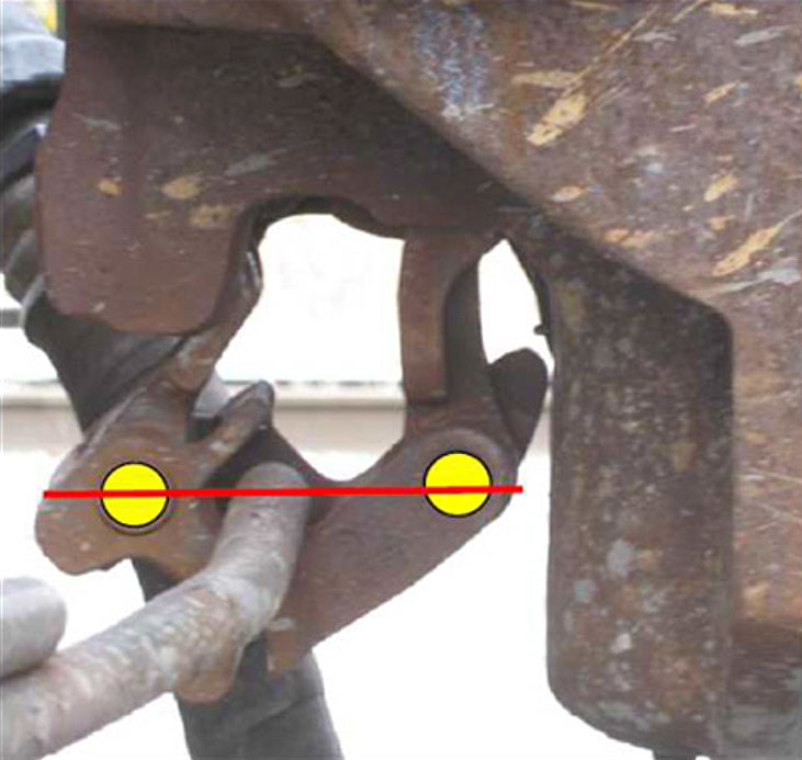 Dans le cadre d'une enquête précédente du BST (R15T0173 Note de bas de page 2 ), on avait établi que le Canadien National (CN) demandait aux membres de ses équipes d'exploitation d'inspecter visuellement l'attelage pour s'assurer que les articulations du lève-verrou d'attelage à manœuvre par le bas étaient correctement alignées. Plus précisément, lorsque le verrou s'est bien logé pour tenir la mâchoire d'attelage, les articulations sont alignées à l'horizontale ( figure 1 ). Si le verrou n'est pas complètement abaissé, les articulations ne sont pas à l'horizontale ( figure 2 ).
