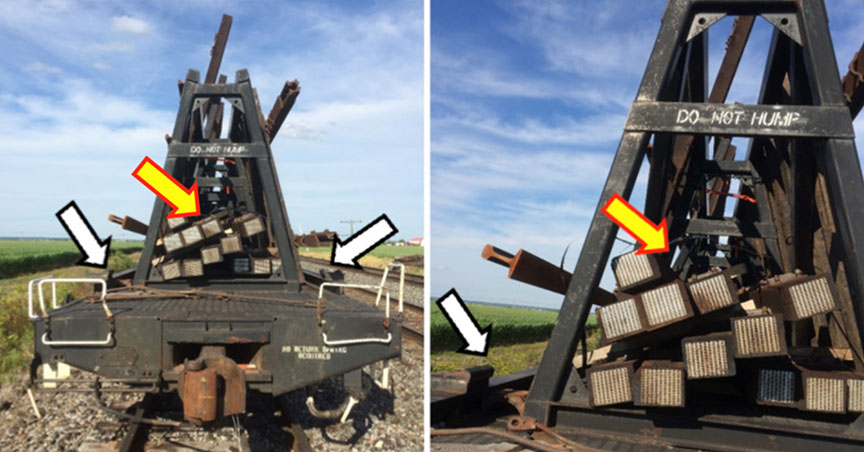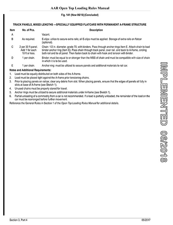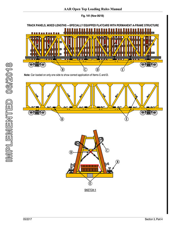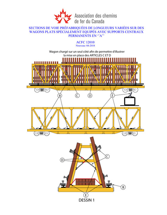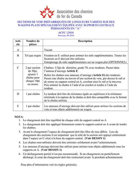 En avril 2018, l'Association des chemins de fer du Canada (ACFC) a publié ses règles sur le chargement de wagons découverts pour les wagons plats à supports centraux en A (annexe A)Note de bas de page 2. De même, en juin 2018, l'Association of American Railroads (AAR) a publié ses règles concernant le chargement des wagons découverts (annexe B)Note de bas de page 3. Les règles de l'ACFC et de l'AAR donnent toutes deux les directives suivantes (entre autres) pour l'arrimage de matériel de voie sur un wagon plat muni d'un support central en A :