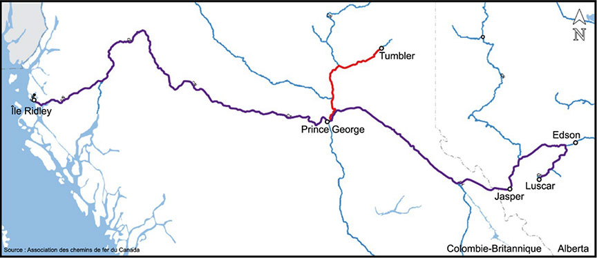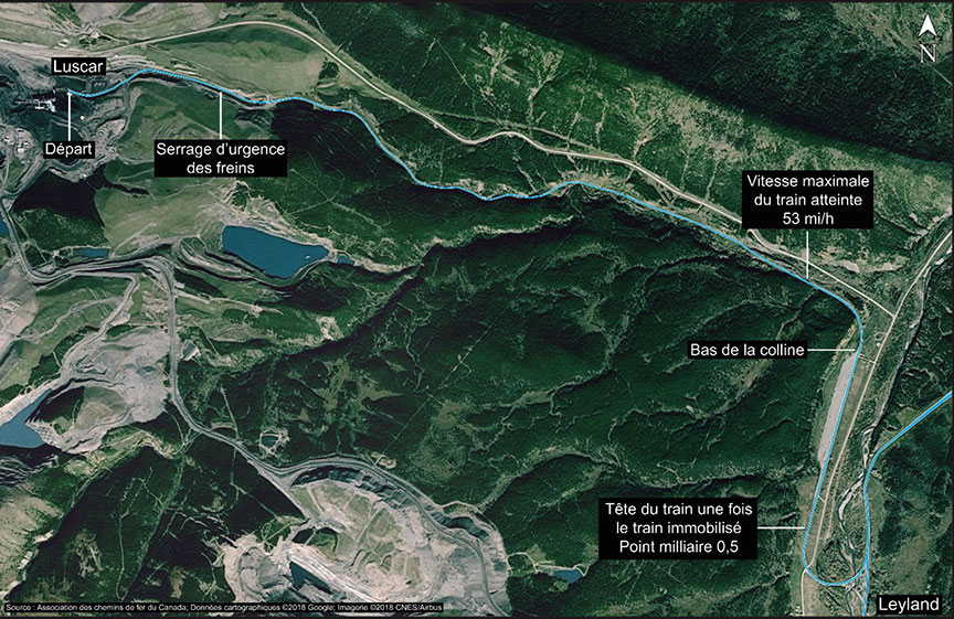 Le 10 janvier 2018, vers 2 h 45, heure des Rocheuses, le train-bloc de charbon classique L76951-10 (le train) du Canadien National (CN) circulait vers le sud sur l'embranchement industriel Luscar depuis les installations de chargement de charbon de la mine Teck, près de Cadomin (Alberta). Il y a eu perte de maîtrise alors que le train descendait une pente abrupte vers Leyland (Alberta) (figure 1). La pente maximale en descente sur cette voie est de 3,0 %. Le train était composé de 3 locomotives et de 58 wagons chargés. Il mesurait 3296 pieds de long et pesait 8097 tonnes. La vitesse maximale permise sur l'embranchement industriel Luscar est de 15 mi/h. Malgré un serrage à fond des freins à air, un système de freins à air complètement rempli et un serrage à fond du frein rhéostatique, l'équipage de conduite a été incapable de maîtriser la vitesse du train. À proximité du point milliaire 4,5, l'équipe de train a serré les freins d'urgence. Or, le train a continué d'accélérer jusqu'à une vitesse de 53 mi/h. Lorsqu'il a atteint le point milliaire 1,4 au bas de la pente, le train a décéléré avant de s'immobiliser au point milliaire 0,5. Au moment de l'accident, la température était de −25 degrés Celsius (événement ferroviaire R18E0007 du BST).