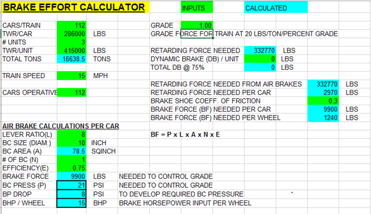 Le tableau ci-dessous présente les calculs de la force de freinage indispensable pour maintenir stationnaire un train de 112 wagons chargés de céréales dans une déclivité de 1,75 %. Ces calculs ne tiennent pas compte de l'effort retardateur additionnel des freins de locomotive que pourraient fournir le ou les freins rhéostatiques (DB) ou le ou les freins directs. De plus :