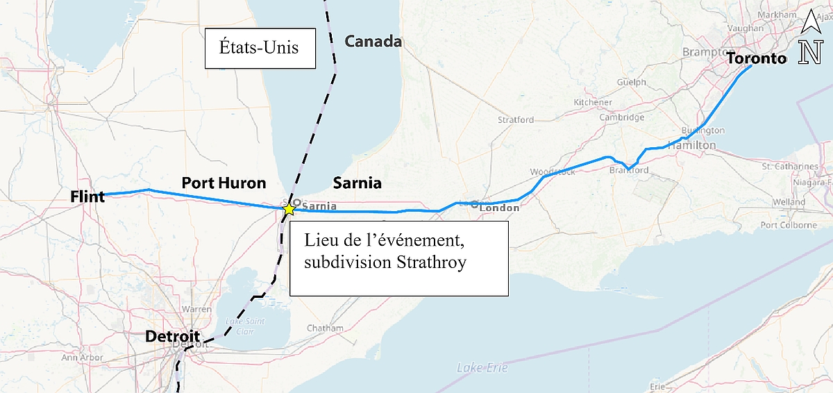 Vers 4 h 2, heure avancée de l’Est , le train, exploité par une équipe de trois personnes (mécanicien de locomotive, chef de train et serre-frein) a quitté Sarnia (Ontario) en direction de Port Huron. Le train est entré dans le tunnel Paul M. Tellier du CN (le tunnel), sous la rivière Sainte-Claire, qui relie Sarnia à Port Huron et traverse la frontière entre le Canada et les États-Unis (figure 1).