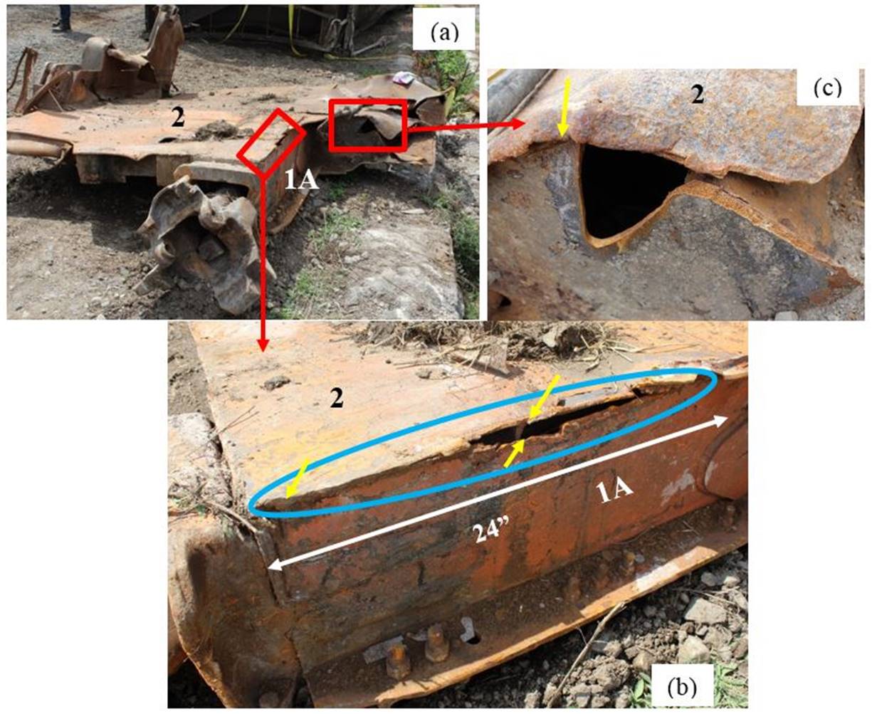 Aperçu; (b) fissure de 24 pouces de long entre la plaque de cisaillement et la longrine tronquée (c) côté gauche du bout A, séparation entre la plaque de cisaillement et la traverse de caisse (Source : BST)