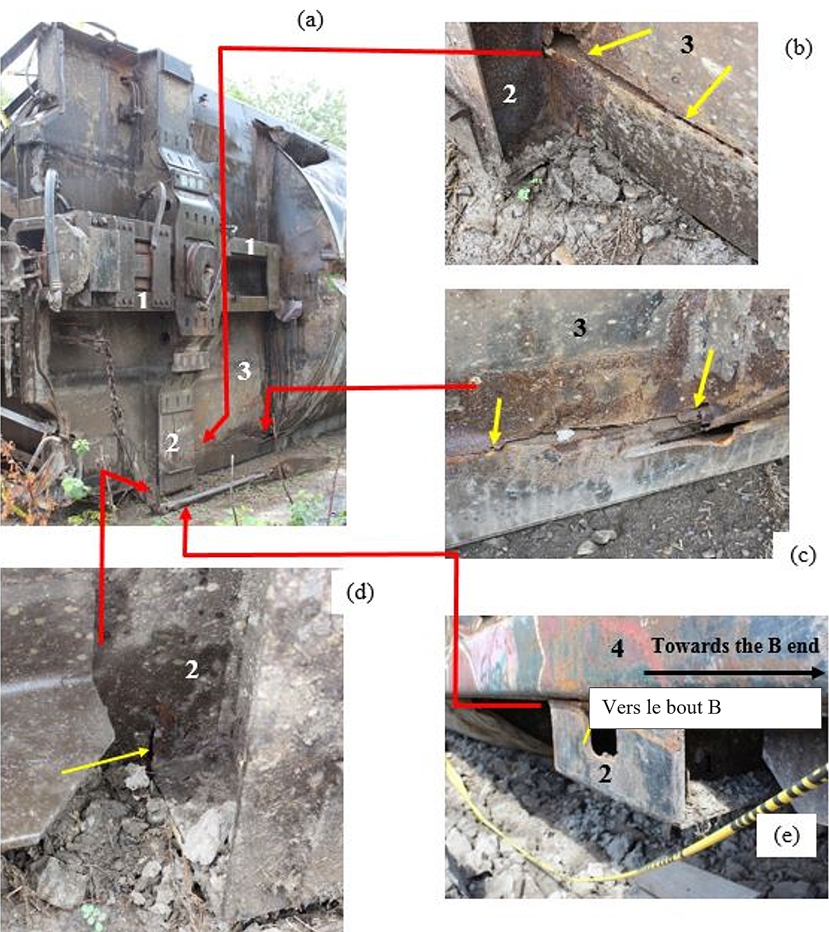 (a) Dessous du bout B montrant la longrine tronquée et la traverse de caisse; (b) et (c) gros plans des fissures relevées sur la plaque de cisaillement (flèches jaunes); (d) et (e) fissures relevées dans le joint entre la traverse de caisse et le brancard (Source : BST)