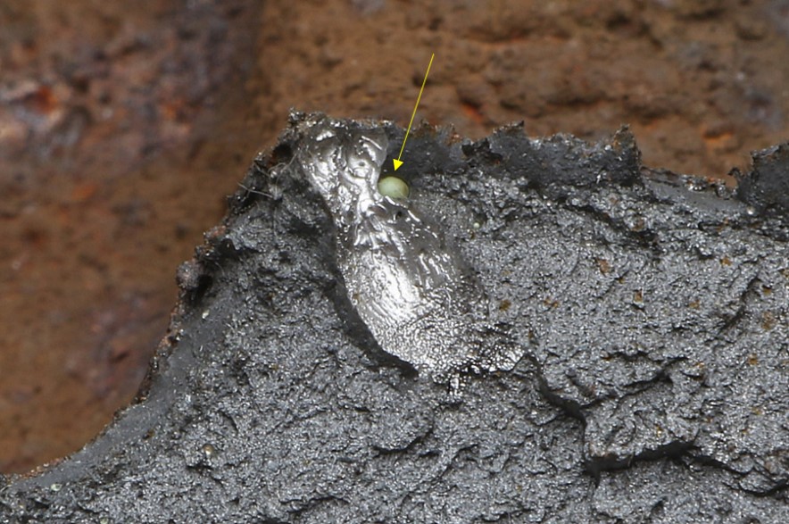 - Un vide de grande dimension et plusieurs autres plus petits ont été notés dans la surface de rupture. À l’intérieur de ces vides se trouvaient des corps étrangers sphériques (indiqués par des flèches à la figure 2 et à la figure 3). Ces corps sphériques, de taille variable, étaient principalement de la silice.