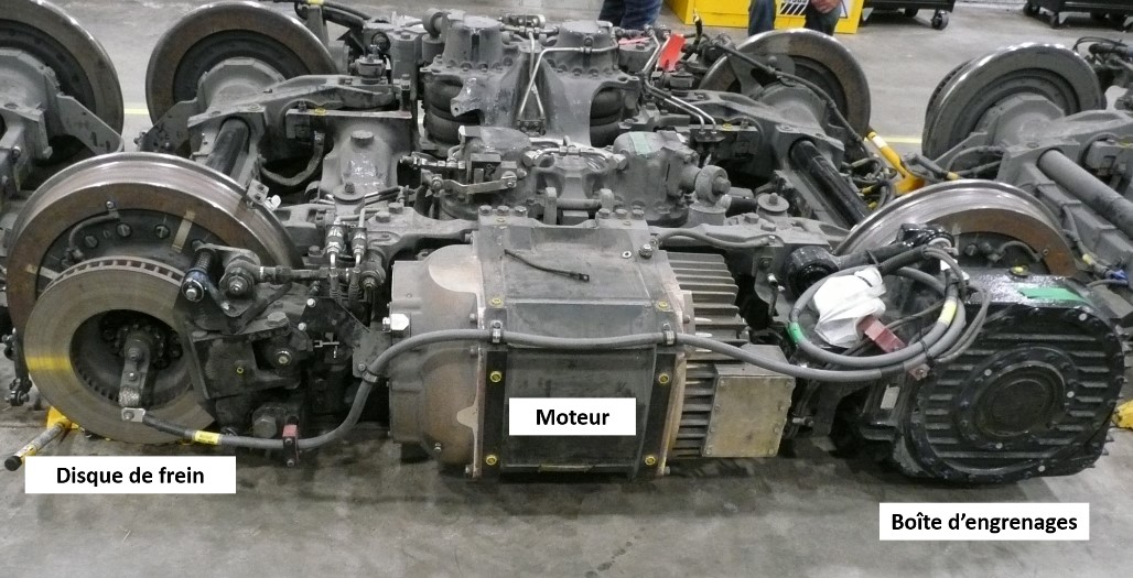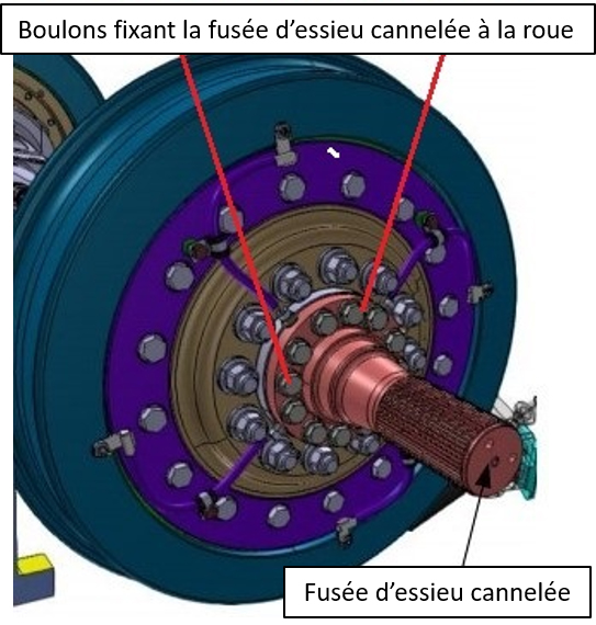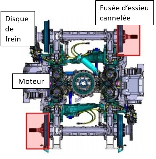 Chaque bogie moteur est équipé de 2 moteurs, 1 de chaque côté du bogie. La puissance de chaque moteur est transmise à une roue motrice par l’intermédiaire d’une boîte d’engrenages qui est reliée à une fusée d’essieu cannelée, également appelée moyeu réducteur, qui est fixée au moyeu de la roue au moyen de 12 boulons (figure 3). Des disques de frein sont fixés au moyeu de roue vis-à-vis de la roue motrice de chaque ensemble de roues de bogie moteur (figure 4), et à chaque roue des bogies porteurs. Les disques sont également fixés au moyeu de roue à l’aide de 12 boulons.
