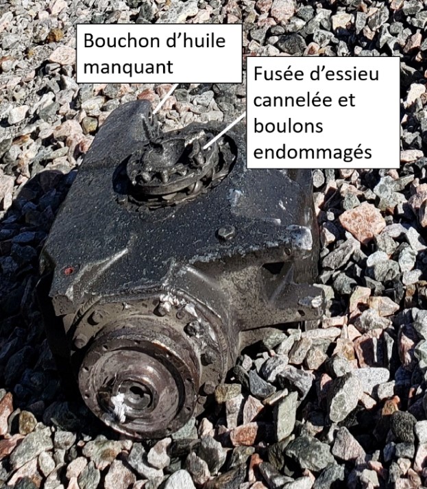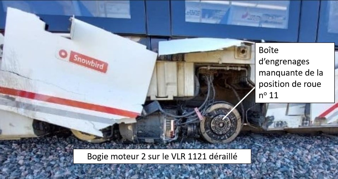 Le BM2 du VLR 1121 avait déraillé du côté nord de la voie. La boîte d’engrenages du moteur à la position de roue no 11 s’était détachée de la roue et était manquante (figure 5).