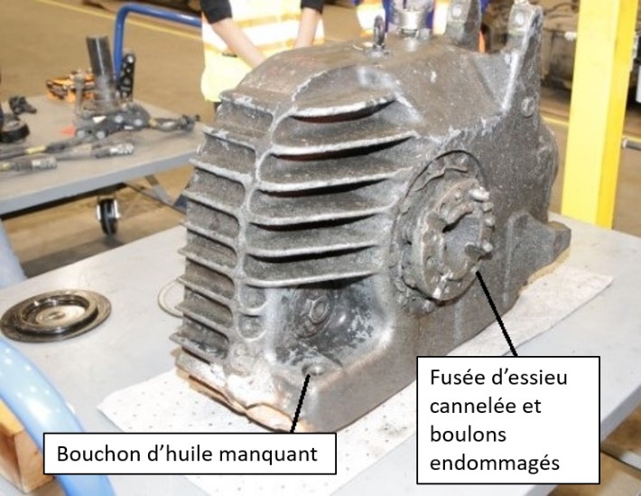 Aucune marque d’impact n’a été observée sur la surface de la boîte d’engrenages près du bouchon d’huile manquant. Seul 1 litre des 6,1 litres d’huile nécessaires au remplissage de la boîte d’engrenages a été récupéré. Bien que les procédures d’Alstom exigent que le bouchon de remplissage d’huile soit serré au couple approprié et que la tête du bouchon soit marquée, aucune indication de ce type n’a été observée. Les boîtes d’engrenages doivent être inspectées pour détecter les fuites d’huile avant de sortir de l’installation d’entretien et de remisage 1; toutefois, les observations du BST suggèrent que les procédures d’Alstom n’ont pas été suivies et qu’il n’y avait probablement pas de bouchon d’huile installé au moment de l’inspection du LRV 1121 à l’installation d’entretien et de remisage 1.