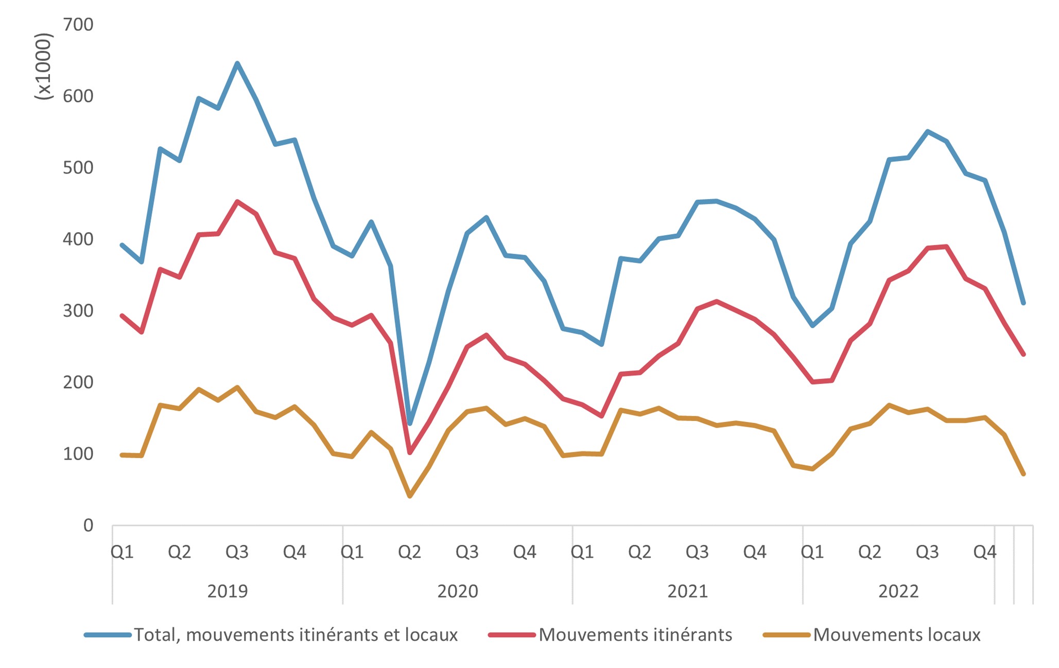 | Années | Trimestre | Total, mouvements itinérants et locaux | Mouvements itinérants | Mouvements itinérants |
