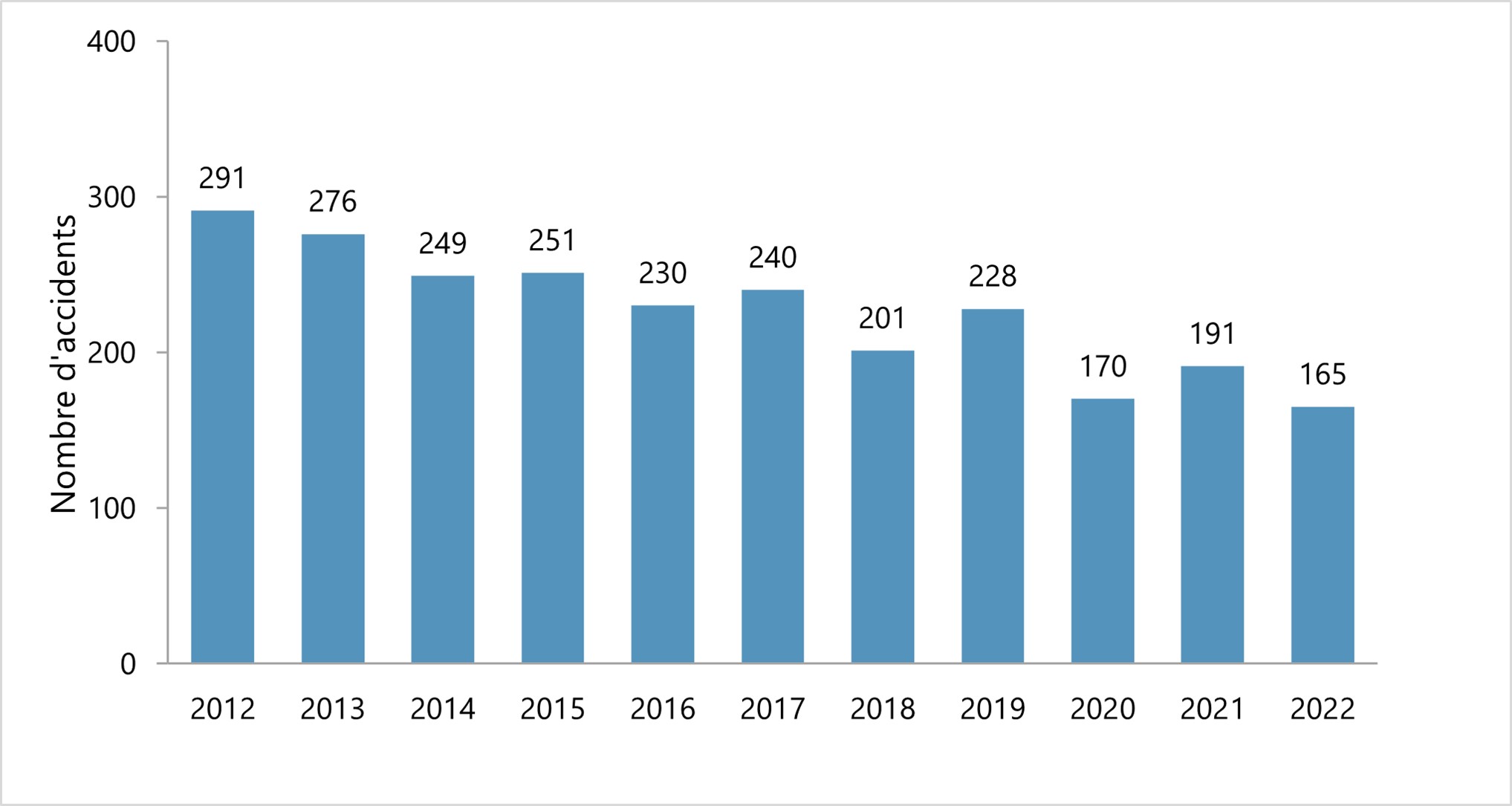 En 2022, on a signalé au BST 165 accidents de transport aérien (tableau 1 et figure 3). Ce nombre est inférieur de 14 % au total de 191 accidents de l’année précédente, et inférieur de 29 % par rapport à la moyenne annuelle de 233 accidents enregistrée pour les 10 années précédentes, soit de 2012 à 2021. La plupart des accidents (152) en 2022 se sont produits au Canada et ont mis en cause des aéronefs immatriculés au Canada. Sept accidents mettant en cause des aéronefs immatriculés au Canada se sont produits à l’extérieur du Canada, et six accidents mettant en cause un aéronef immatriculé à l’étranger se sont produits au Canada. En général, le nombre d’accidents de transport aérien a diminué au cours des 10 dernières années.