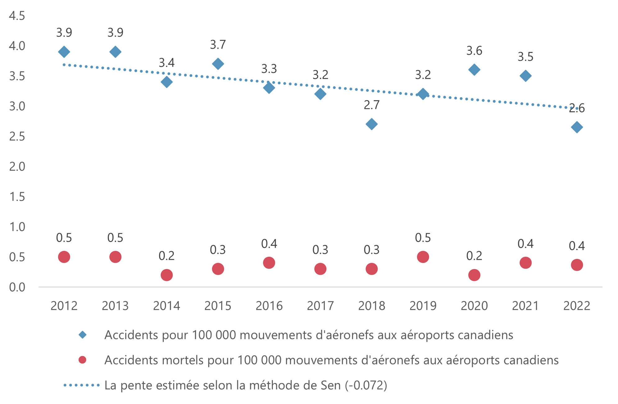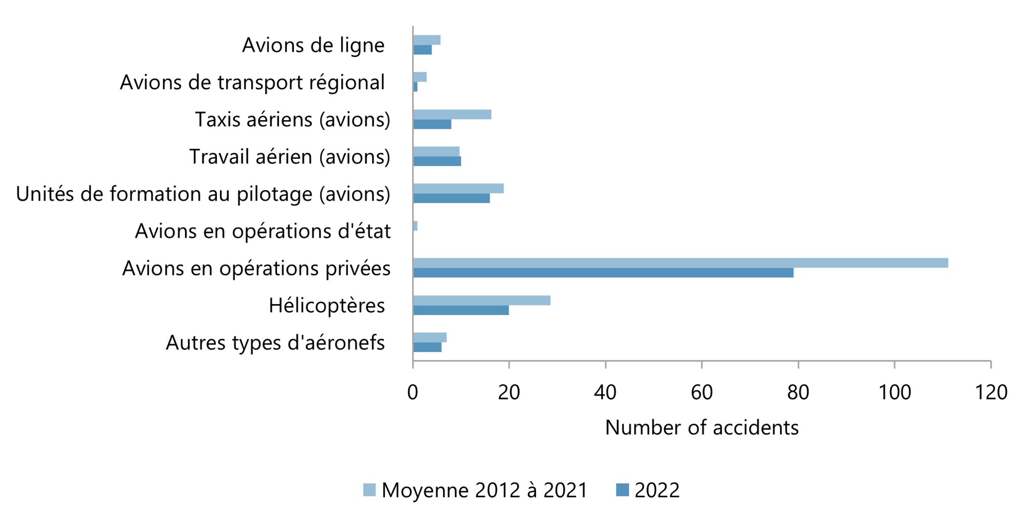 On a signalé 145 accidents mettant en cause des aéronefs immatriculés au Canada (à l’exclusion des ultralégers) en 2022 (tableau 2). Ce nombre est inférieur de 15 % au total de 170 accidents en 2021, et inférieur de 28 % à la moyenne de 203 accidents au cours des 10 années précédentes (de 2012 à 2021). En comptant les 15 accidents mettant en cause des ultralégers, il y a eu 160 accidents mettant en cause des aéronefs immatriculés au Canada en 2022.