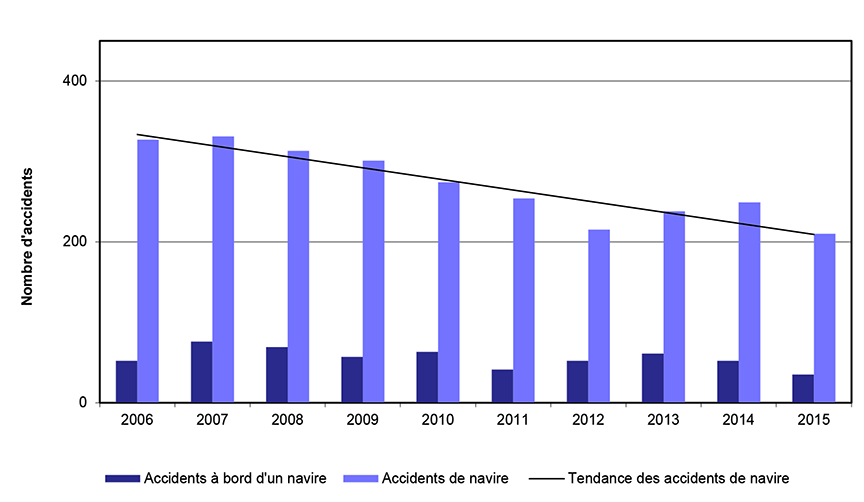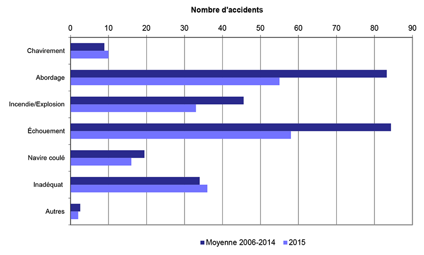 En 2015, 245 accidents maritimes (voir Définitions ci-dessous) ont été signalés au BST, en baisse par rapport à 301 en 2014 et à la moyenne de 300 accidents pour la période de 2010 à 2014. Au cours des 10 dernières années, 83 % des accidents maritimes étaient des accidents de navigation; les autres étaient des accidents à bord d'un navire.