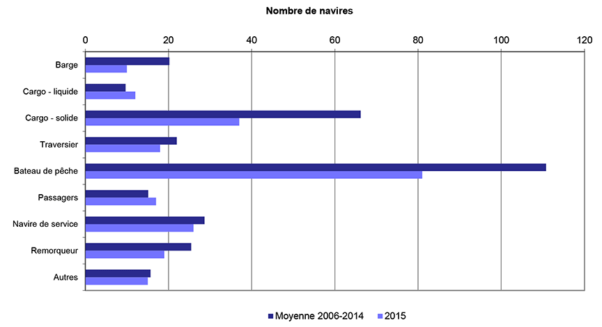 En 2015, 86 % des 235 navires en cause dans des accidents de navigation signalés au BST étaient des navires canadiens. Au total, 41 % de ceux-là étaient des navires de commerce autres que des bateaux de pêche, 39 % étaient des bateaux de pêche et les 20 % restants étaient des navires non commerciaux, des embarcations de plaisance ou des navires de service.