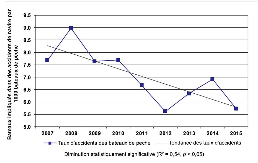 En 2015, il y avait environ 13 953 bateaux de pêche actifs au CanadaNote de bas de page 1. Le taux d'accidents de navigation pour les bateaux de pêche canadiens a diminué, passant de 6,9 bateaux de pêche en cause dans des accidents de navigation par 1000 bateaux de pêche actifs en 2014, à 5,7 en 2015, et a diminué par rapport à la moyenne quinquennale de 6,7. Par ailleurs, on a constaté une tendance à la baisse statistiquement significative du taux d'accidents de navigation mettant en cause des bateaux de pêche canadiens au cours des 10 dernières années (p <0,05) (figure 7).
