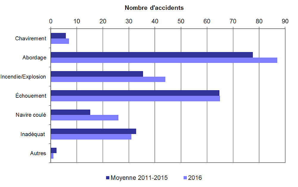 Il y a eu 261 accidents liés à la navigation en 2016, soit une hausse de 23 % comparativement au nombre total de 213 en 2015 et de 12 % comparativement à la moyenne de 234 de 2011 à 2015, mais une baisse de 4 % par rapport à la moyenne annuelle de 2006 à 2015 (272).