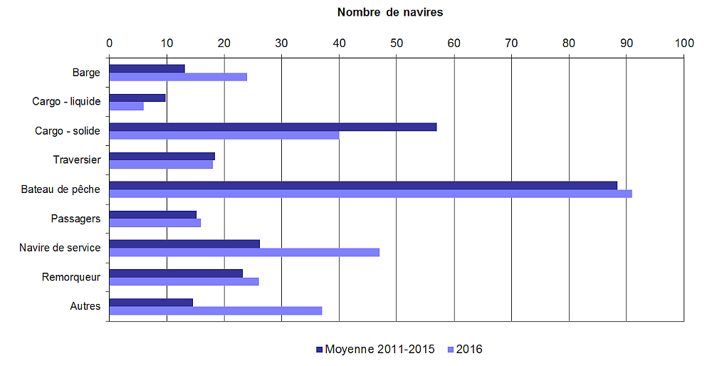 En 2016, 89 % des 305 navires en cause dans des accidents de navigation signalés au BST étaient des navires canadiens. Au total, 37 % d'entre eux étaient des navires de commerce autres que des bateaux de pêche, 33 % étaient des bateaux de pêche et les autres 30 % étaient des navires non commerciaux, des embarcations de plaisance ou des navires de service.