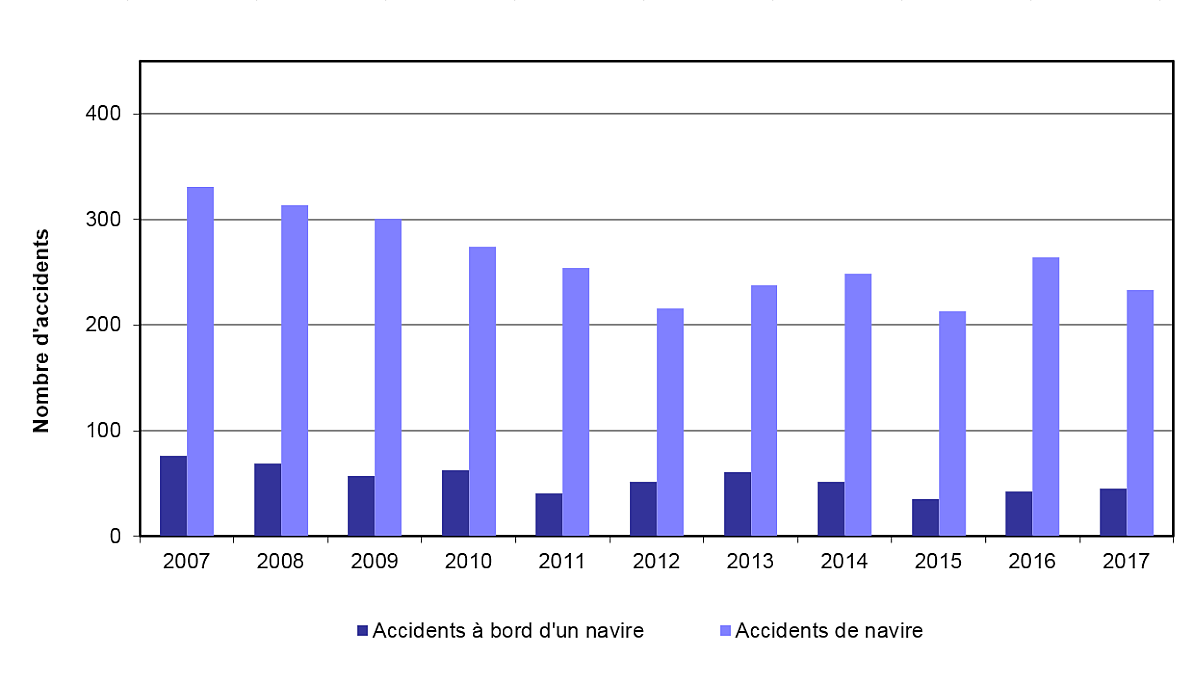 En 2017, on a enregistré 233 accidents de navigation; ce nombre est en baisse de 12 % comparativement au nombre total en 2016 (264) et par rapport à la moyenne de 2007 à 2016 (265). La plupart des accidents de navigation mettaient en cause des bateaux de pêche (33 %), suivi des navires de service (14 %) et des navires qui transportent des cargaisons solides (15 %).