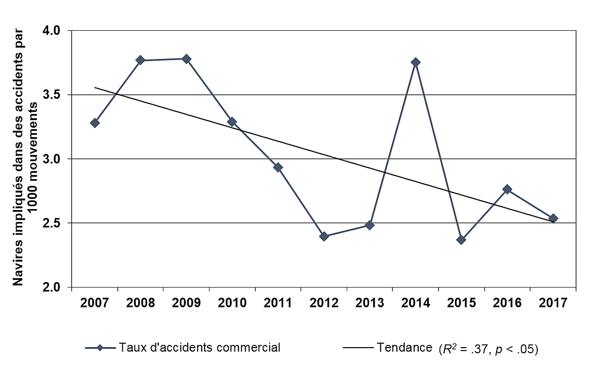 D'après les renseignements fournis par Transports Canada, l'activité maritime des navires de commerce canadiens autres que des bateaux de pêche dont la jauge brute est de plus de 15, à l'exclusion des navires à passagers et des navires de croisière, a été estimée à 29 156 mouvements commerciauxNote de bas de page 3 en 2017. Ce nombre constitue une hausse de 4 % comparativement à la moyenne de la période 2007 à 2016. En 2017, le taux d'accidents s'est donc établi à 2,5 accidents de navigation par 1000 mouvements commerciaux et est en baisse comparativement à la moyenne décennale précédente de 3,1. Par ailleurs, on a constaté une tendance à la baisse statistiquement significative du taux d'accidents de navigation mettant en cause des bateaux commerciaux canadiens au cours des 11 dernières années (p<.05) (figure 6).